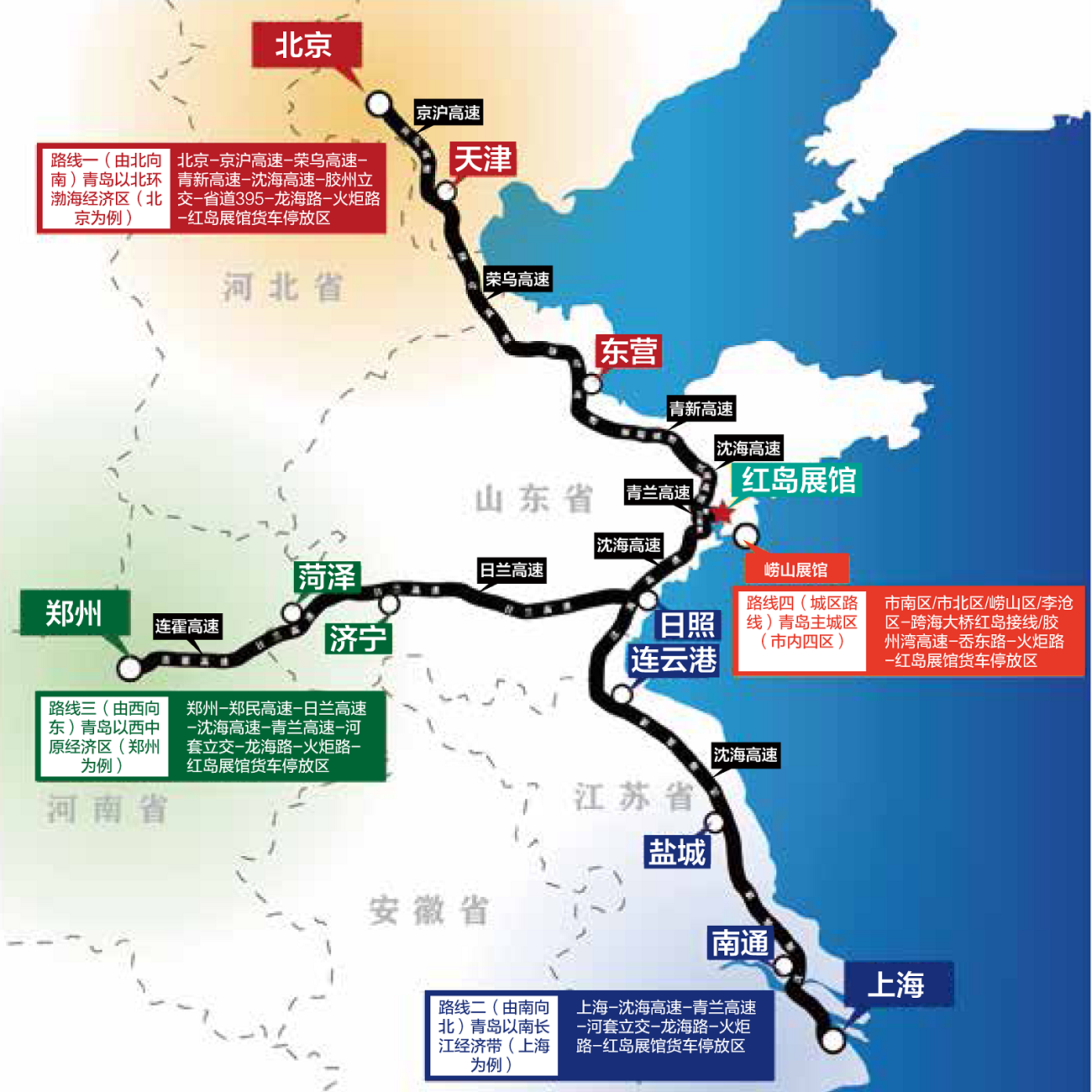 - (市內四區,青島主城區路線):市南區/市北區/嶗山區/李滄區-跨海大橋紅島接線/膠州灣高速-岙東路-火炬路-紅島展館貨車停放區